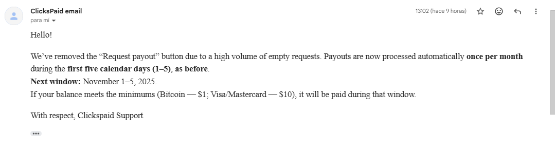 ClicksPaid payout received. It was a pretty good month. Hope everyone else received theirs. Make sure to update your preferred payment method in settings. Manual payout requests have not returned, for now at least. It is nice to see ClicksPaid got payments out by the 3rd, even after the holiday (Halloween in the USA). Sometimes we just need some patience. This site has been a solid source of side income for me.